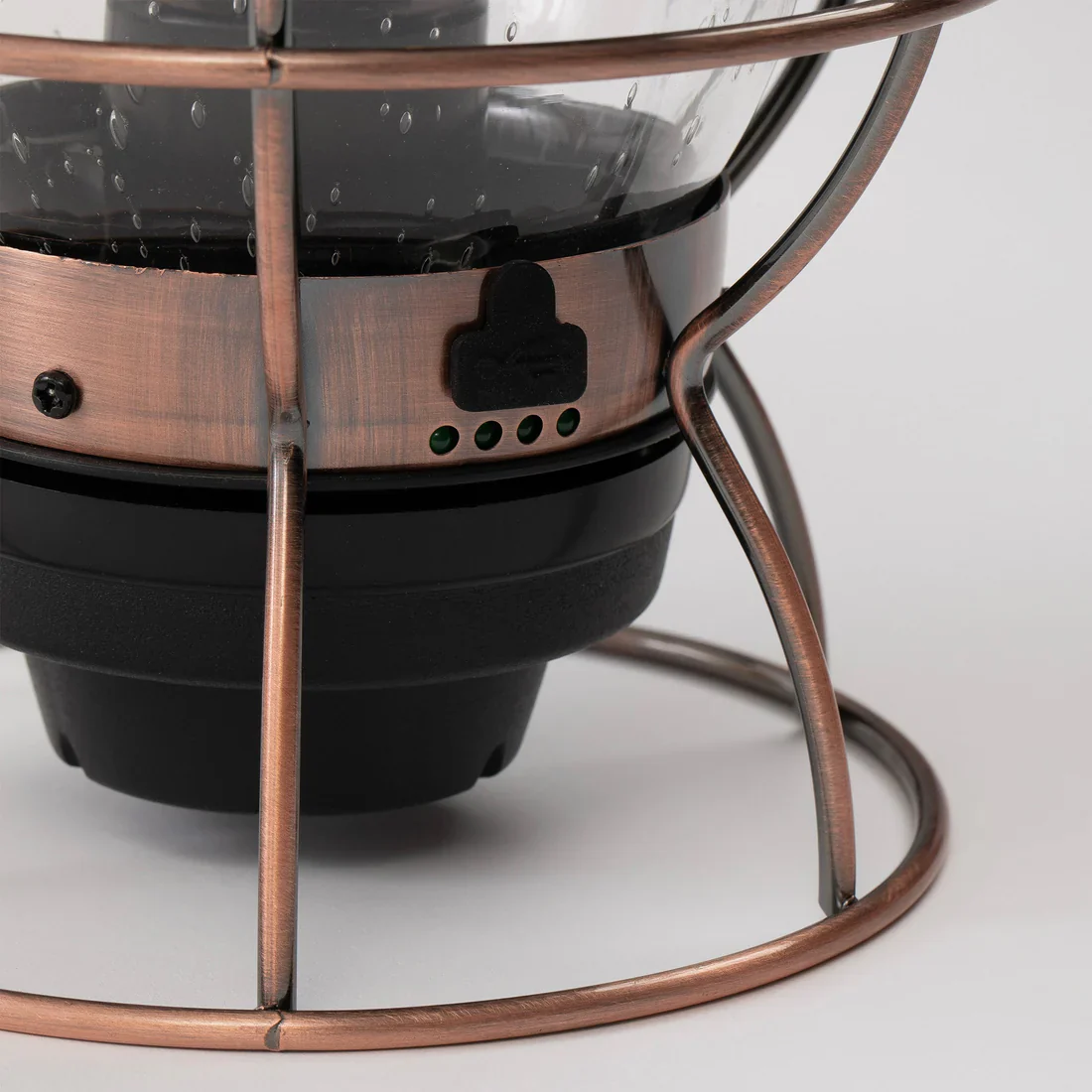 Eine moderne Variante einer antiken und beliebten Laterne von Union Pacific. Wunderschönes Glas- und Kupferakzente machen dies zu einem einzigartigen Licht für einen schönen Esstisch oder im Camp. High-Tech und funktional, diese Laterne verwendet Batterie oder USB mit einer Laufzeit von über 100 Stunden bei niedriger oder 3,5 Stunden bei hoher Leistung. LED-Glühbirne im Edison-Stil mit einstellbarer Helligkeit bietet ein klassisches wärmendes Leuchten, das sich perfekt für jede Gelegenheit eignet.