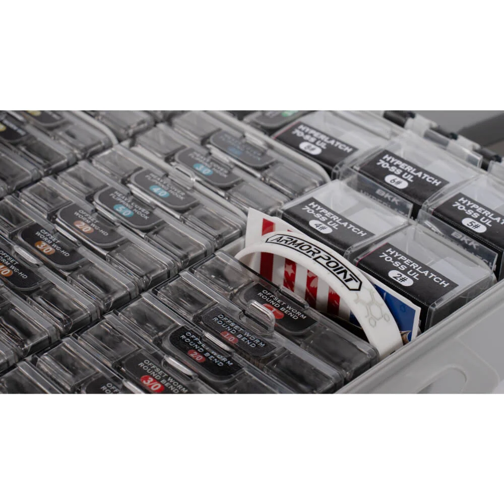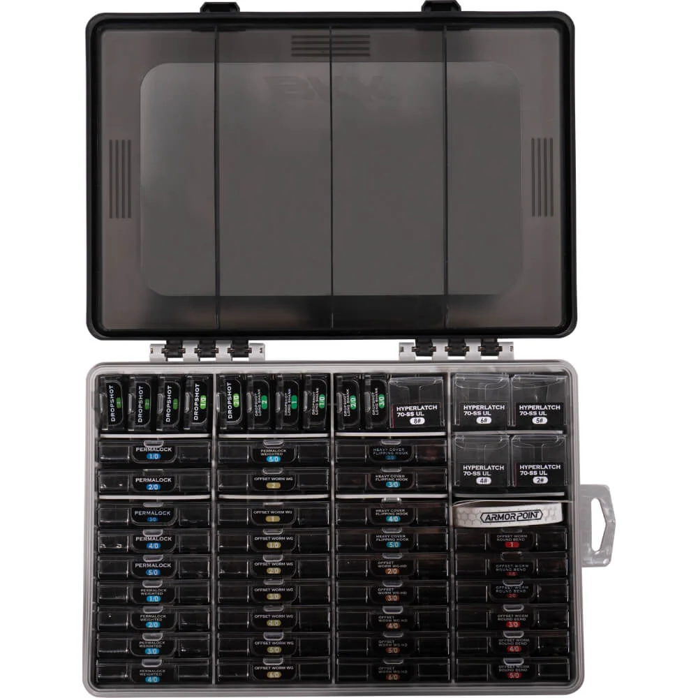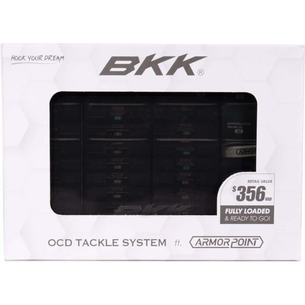 Das BKK Complete Armor-Point OCD Kit ist ein revolutionäres Lagerungssystem aus robustem Kunststoff und speziell für Haken konzipiert. Die Experten von BKK haben ein System entwickelt, welches es dir erlaubt alle deine benötigten Haken gut sortiert beisammen zu haben. Die Haken werden in kleinen Mehrzweck-Boxen aus Kunststoff gelagert, die perfekt in die Aussparungen der Box passen. Diese Mehrzweck-Boxen sind am oberen Ende beschriftet, so hast du immer alles bestens im Blick und den gesuchten Haken schnell zur Hand, ideal für ambitionierte Turnierangler. Die hochwertige Dichtung der wasserdichten Box sorgt dafür, dass der Inhalt immer gut geschützt ist vor Feuchtigkeit und Schmutz. Verschlossen wird die Box mit zwei starken Verschlüssen, damit auch immer alles dort bleibt, wo es hingehört.