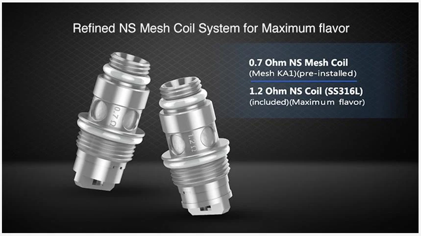 Coil: 0,7 Ohm NS Mesh Coil (Mesh KA1) (vorinstalliert), 1,2 Ohm NS-Spule (SS316L) (inklusive)