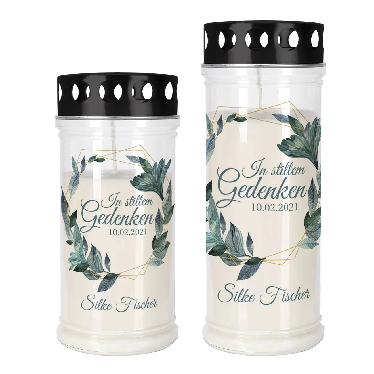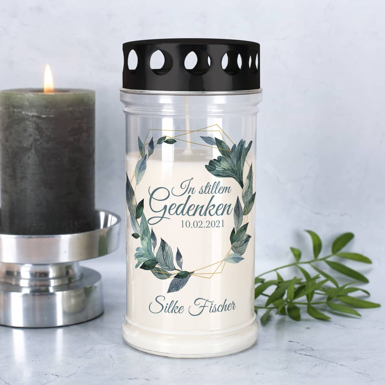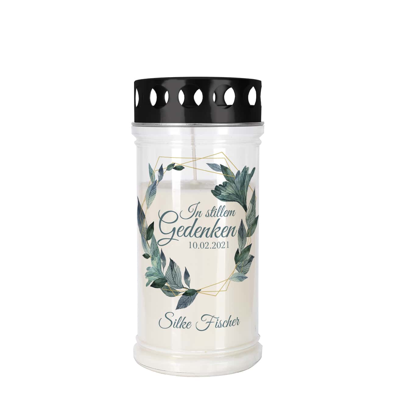 Grablicht mit Druck von Blätterkranz, Name und Datum