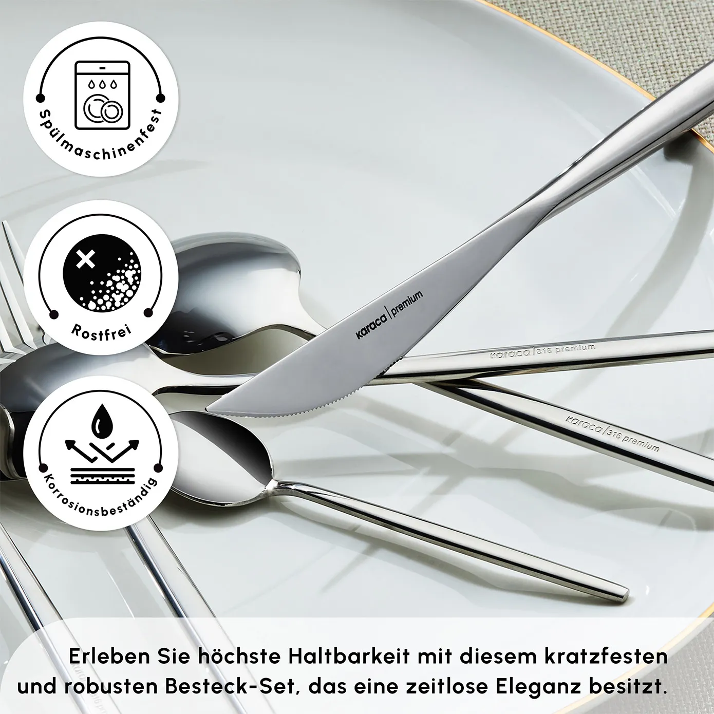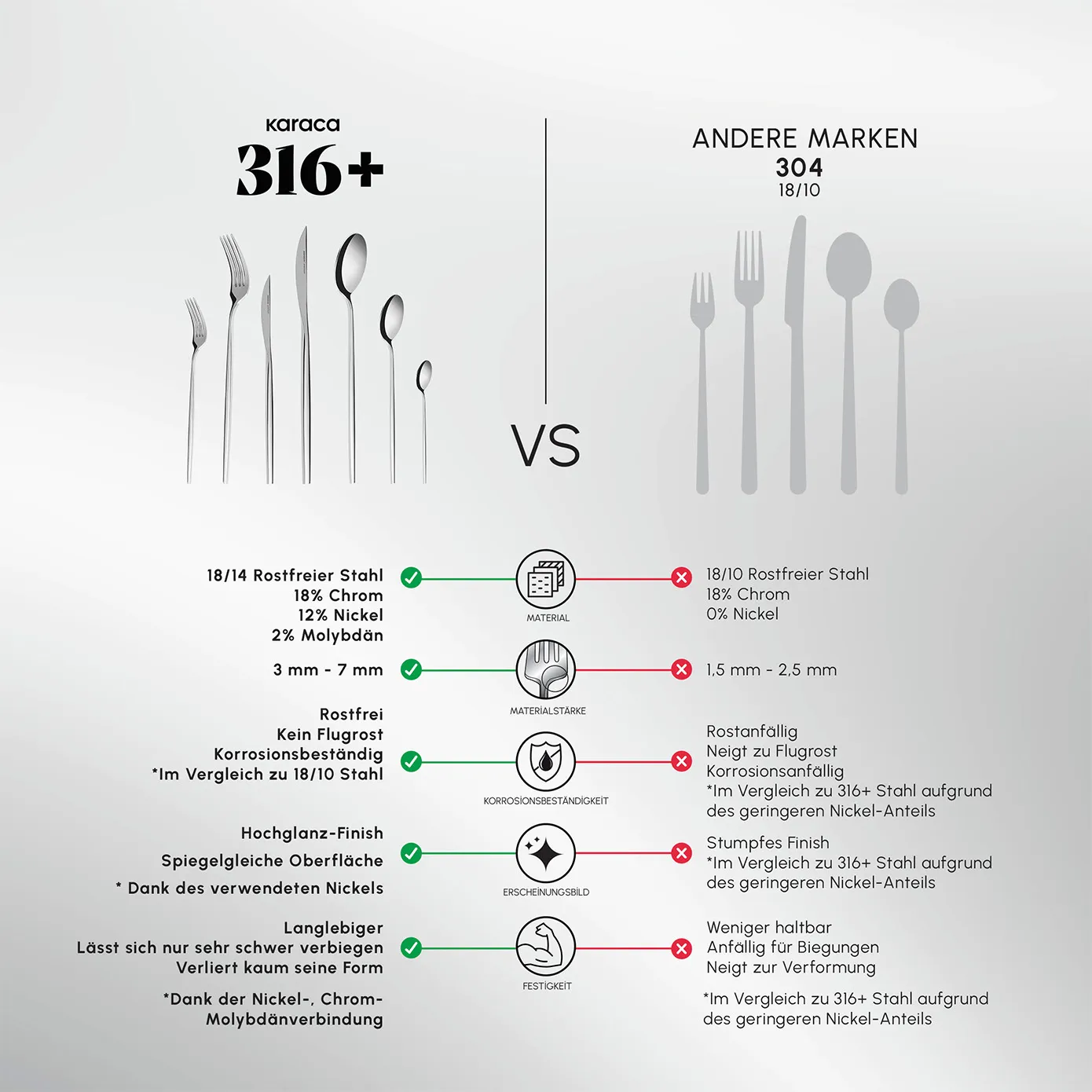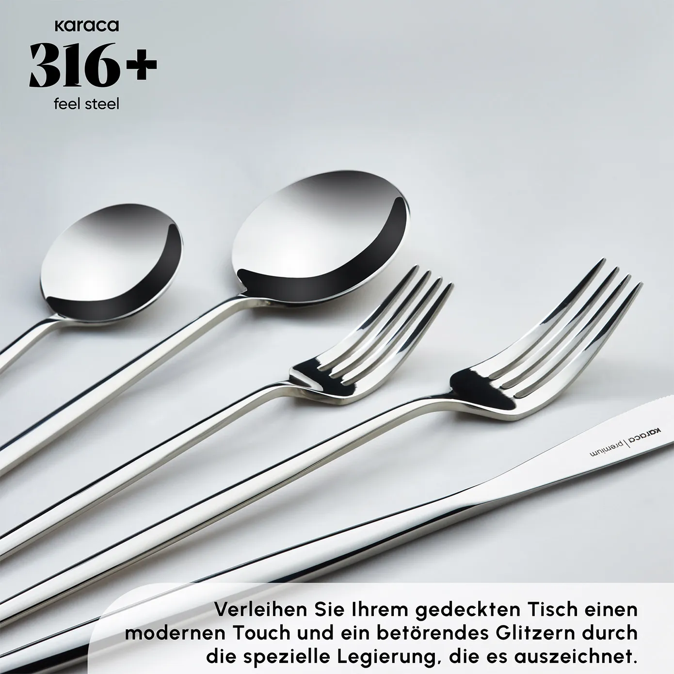 316+ Stahl, den Karaca durch die Hinzufügung von 18 % Chrom, 12 % Nickel und 2 % Molybdän zu Standardstahl erhält, ist 42 % haltbarer als bekannte Stähle. Außerdem ist es bis zu 53 % widerstandsfähiger gegen Rost und Kratzer, selbst unter schwierigen Bedingungen. Spülmaschinenfest.