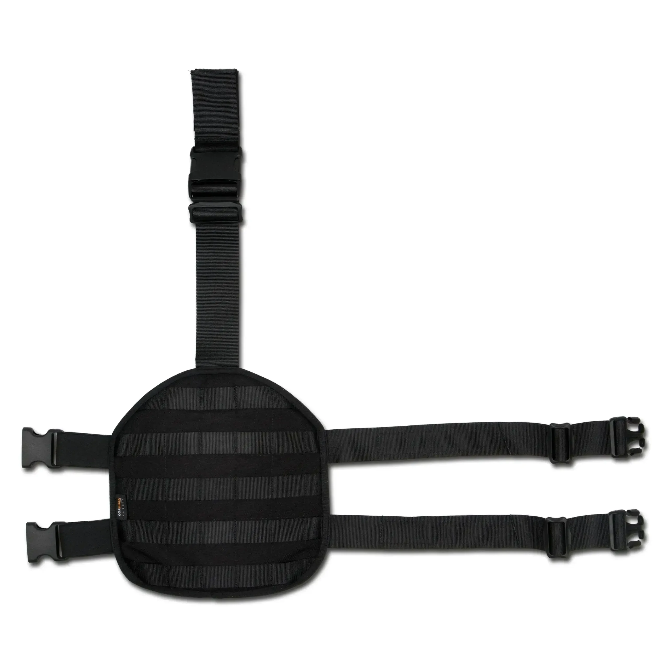 Große, verstärkte Beinplatte mit Molle-Webbing zur Aufnahme von Holstern, Magazinen oder Zubehör. 2 rutschfeste, verstellbare Beinriemen sichern die Platte am Oberschenkel. Schlaufe zur Fixierung am Koppel.