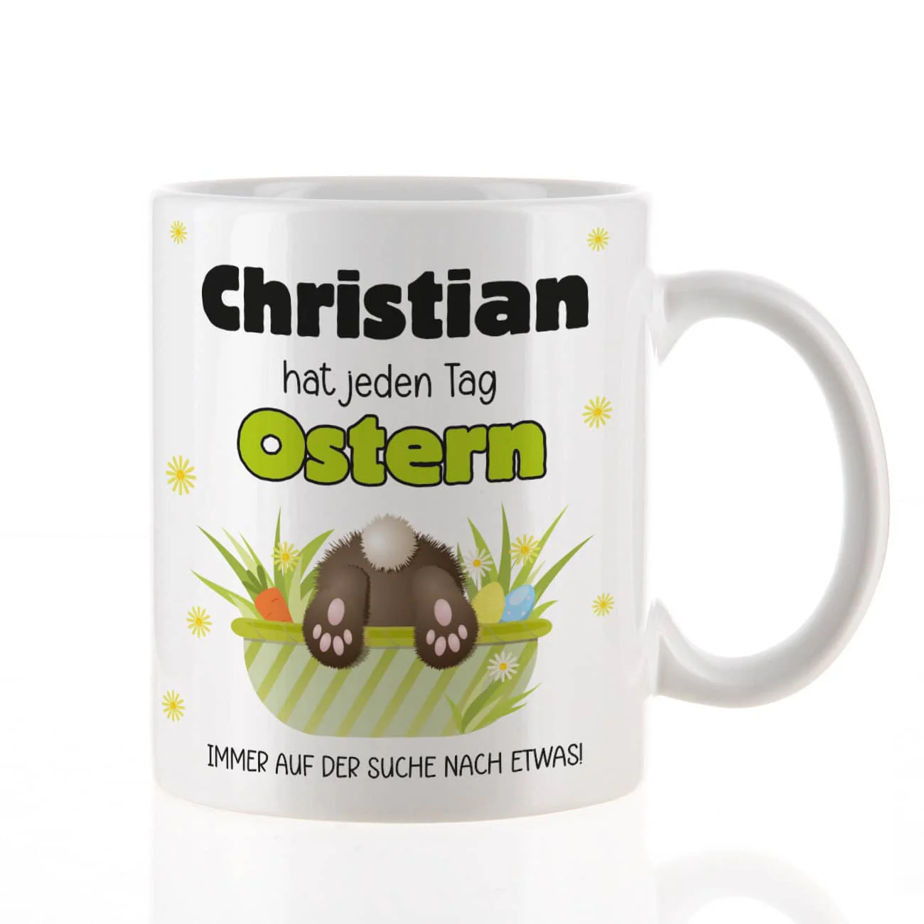 Wer immer auf der Suche nach etwas ist, für den oder die ist das ganze Jahr über Ostern! Mit dieser witzigen Tasse haben Sie ein tolles Ostergeschenk, das man auch nach den Feiertagen weiter nutzen kann. Zu lesen ist der Name der beschenkten Person, auf den der Spruch „…hat jeden Tag Ostern. Immer auf der Suche nach etwas!“ folgt. Zuletzt sieht man den flauschigen Po eines Osterhasens, der fleißig in einem Osternest kramt und scheinbar nach etwas Wichtigem sucht. Vielleicht sucht er ja nach einer leckeren Osternascherei? Mit solch einer Tasse wird man Zuhause und auch im Büro riesige Freude haben. Beschenken Sie also jemanden aus Ihrer Familie, Kollegen und Kolleginnen oder Freunde.