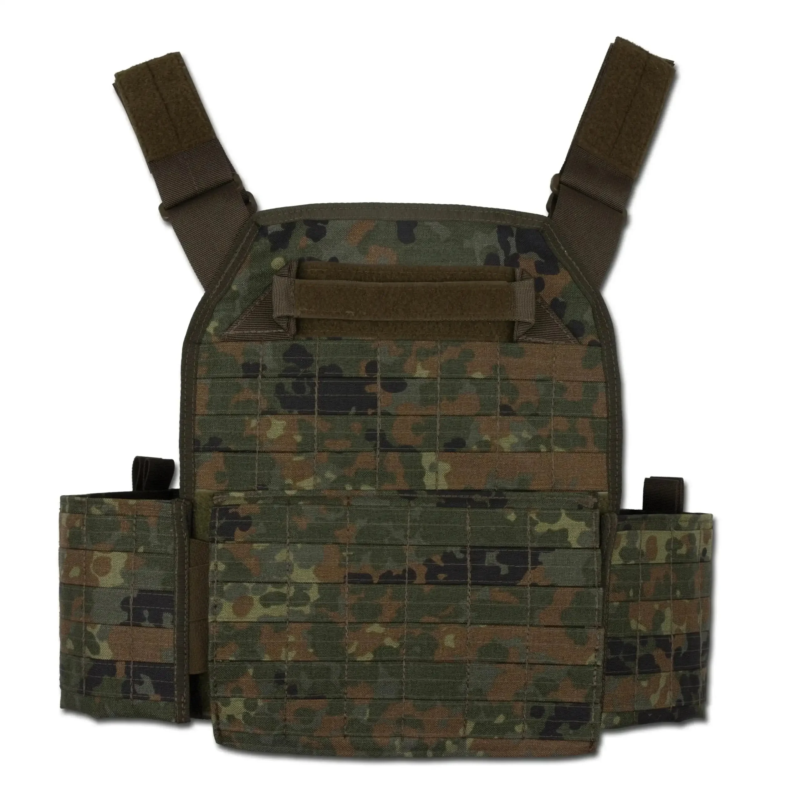Der Zentauron Plattenträger Vulcan flecktarn fasst zwei SAPI Keramikplatten in Größe M sowie entsprechende Seitenplatten und Softeinlagen. Bestückt wird er über zwei große Klettklappen, die innenseitig an der Front- und Rückseite angebracht sind. Die integrierten Taschen der seitlichen Modularschlaufenflächen sind für schützende Seitenplatten vorgesehen. Durch den Kummerbund ist der Plattenträger benutzerfreundlich auf die verschiedenen Bedürfnisse und Größen anpassbar. Einfach die eingearbeiteten Klettplatten hochklappen und den Kummerbund auf die gewünschte Weite einstellen. Nach dem Herunterklappen behalten alle Flächen dank des Klettsystems die gewählte Position sicher und zuverlässig.