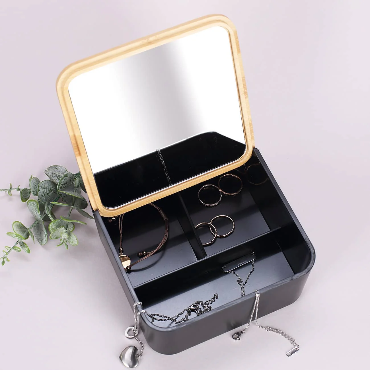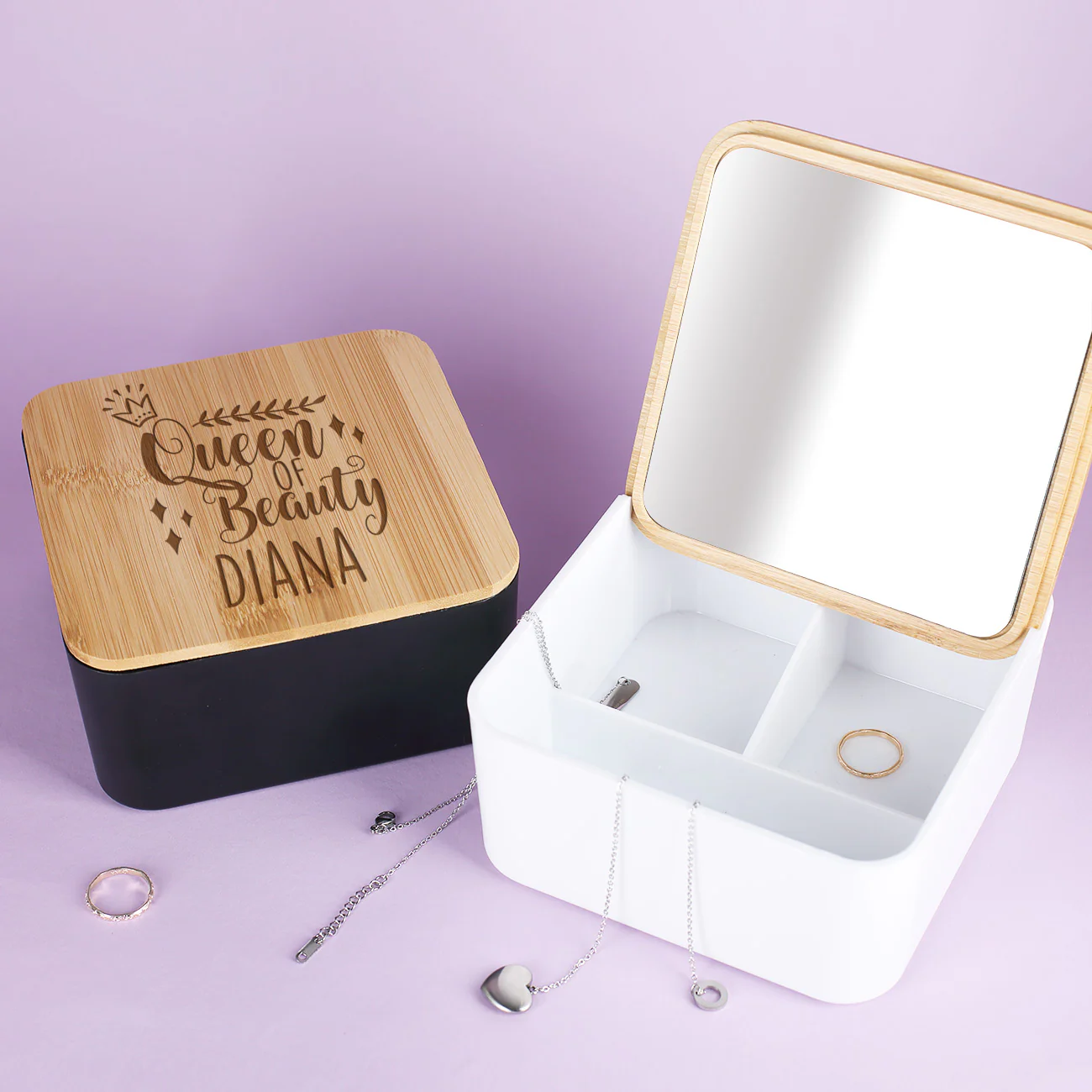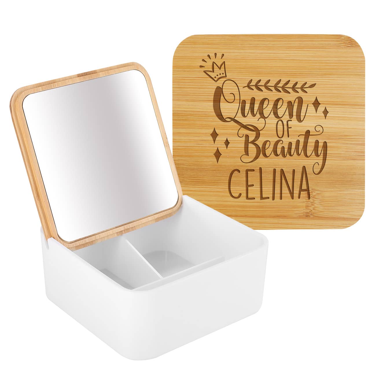Erfreuen Sie die Beautyqueen in Ihnen mit unserem süßen Schmuckkästchen, auf der der Bambusdeckel mit Ihrem Namen graviert ist. Erhältlich in elegantem Schwarz oder reinem Weiß, wird diese Schatulle zu einem stilvollen Begleiter für die Aufbewahrung von Schmuck und kleinen Schätzen. Der Clou: Ein Spiegel im Deckel, der nicht nur funktional ist, sondern auch in der Box aufgestellt werden kann. So haben Sie beim Zurechtmachen beide Hände frei – ein praktisches Detail für alle Beautyfans. Wunderbar eignet sich dieser Schmuckkasten auch als Geschenk für Frauen an eine andere Beautyqueen in Ihrem Leben, beispielsweise zum Muttertag oder Geburtstag.