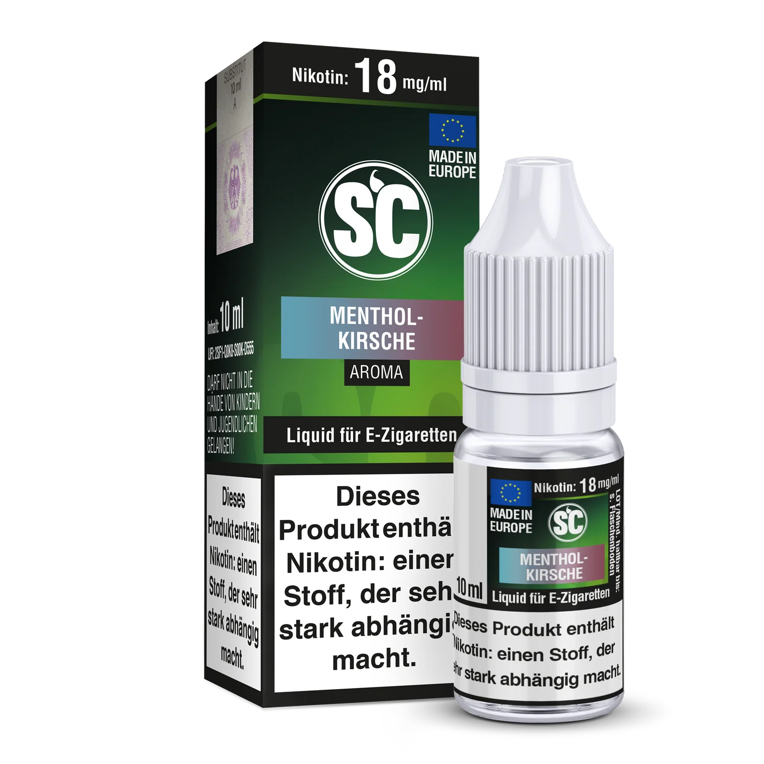 Mit jeder SC Liquid Flasche, erhalten Sie 10 ml Liquid von dem gewählten Liquid Aroma und der gewählten Stärke. Ihnen stehen insgesamt 5 Stärken mit und ohne Nikotin zu Auswahl. Das SC Menthol-Kirsche E-Zigaretten Liquid schmeckt beim Dampfen nach Kirschen und Menthol.