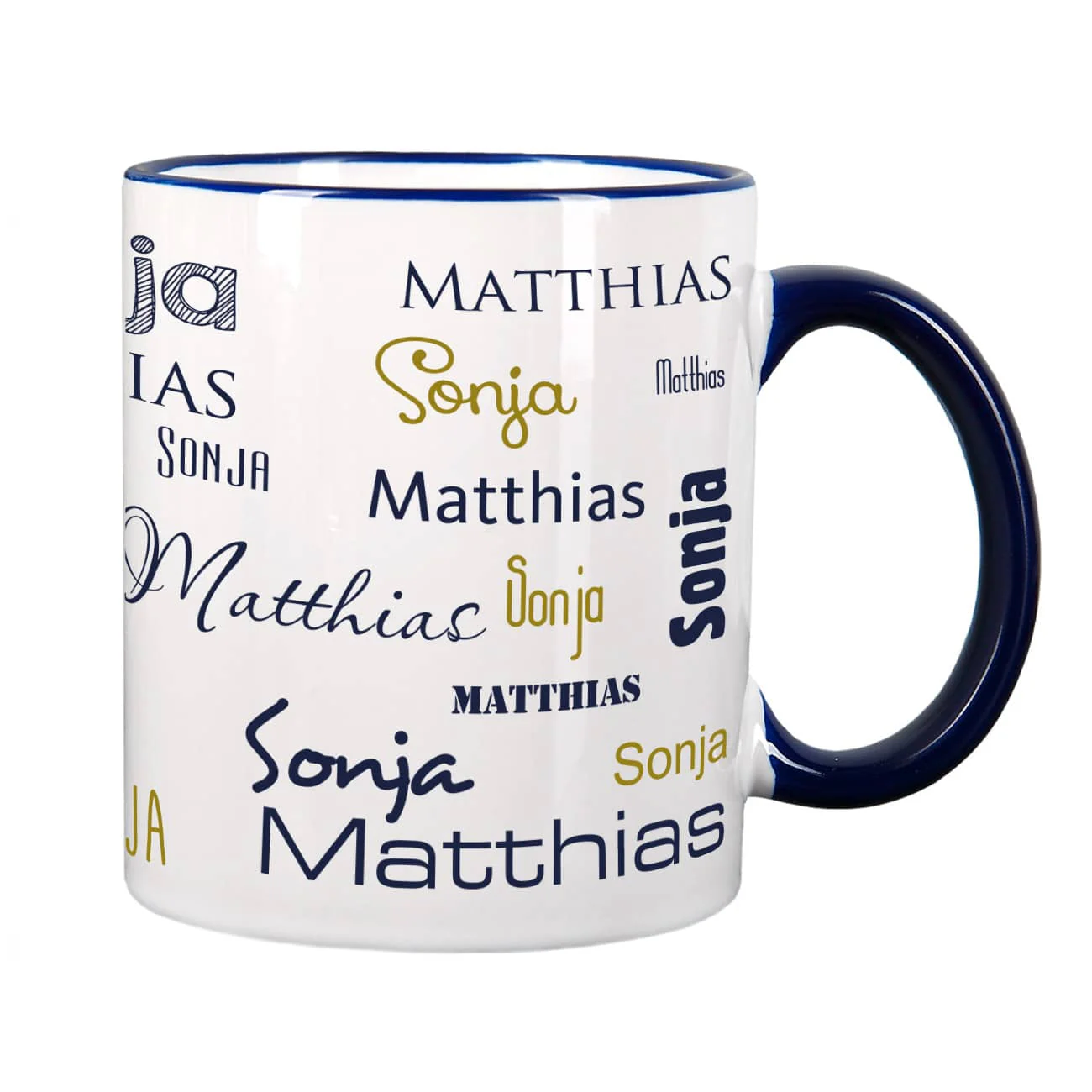 Tasse mit zwei Namen in verschiedenen Schriftarten