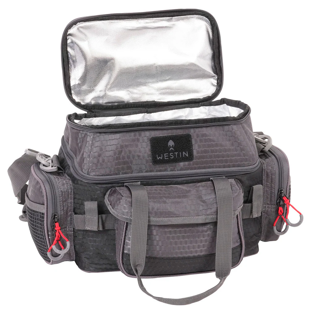 Die Westin W4 Lure Bag Plus ist eine Schultertasche mit diversen Extras und eignet sich gleichermaßen für den Einsatz am Ufer und auf dem Boot. Das Obermaterial besteht aus doppelt gewebtem Hexagon-Polyester. Dieses Material ist nicht nur wasserfest, sondern verleiht der Tasche auch einen einzigartigen Look. Der Boden ist zusätzlich verstärkt und ebenfalls wasserfest, so ist ein Abstellen auch bei schlechten Witterungsverhältnissen kein Problem. Das Hauptfach bietet Platz für 4 Tackleboxen, die bei dieser Tasche bereits enthalten sind. So kannst du dir sicher sein, dass deine Köder immer gut organisiert sind. Ein besonderes Extra der Westin W4 Lure Bag Plus ist das im Kopfteil integrierte Kühlfach, welches immer für bestens gekühlte Lebensmittel sorgt.