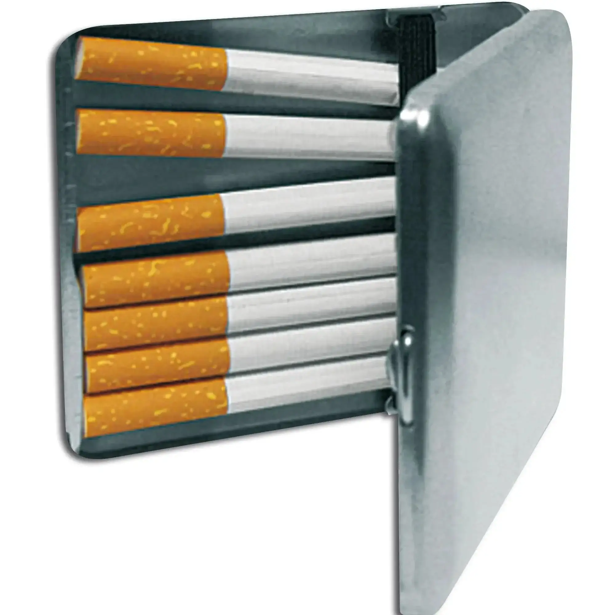 Solide Metallbox mit satiniert vernickelter Oberfläche für ca. 20 Zigaretten. Klassische deutsche Form. Mit Gravur auf der Vorderseite.